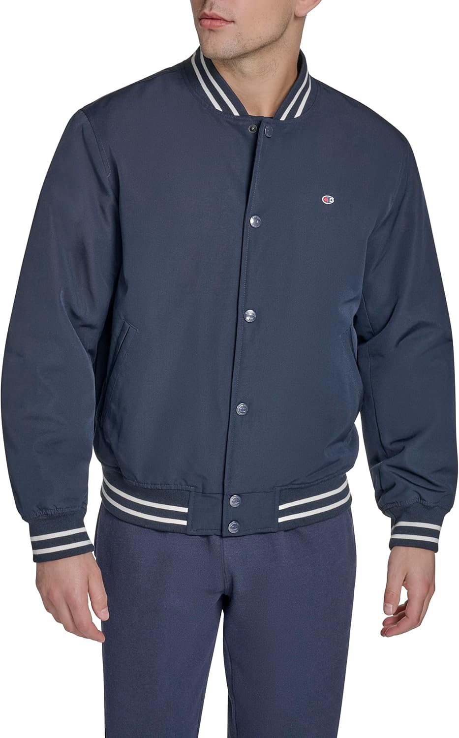 Two Lower Welt Pockets: Practical storage for your essentials while keeping your hands warm. Center Front Snap Zipper Placket Closure: Provides a secure and adjustable fit, making it easy to wear. Striped Rib Knit at Cuffs, Hem, and Collar: Adds a retro touch and ensures a snug, comfortable fit. Varsity-Inspired Design: Combines a classic bomber silhouette with bold logo striped trims for a sporty, stylish look. Champion Branding: Features the iconic Champion logo on the chest for a signature, athletic finish.