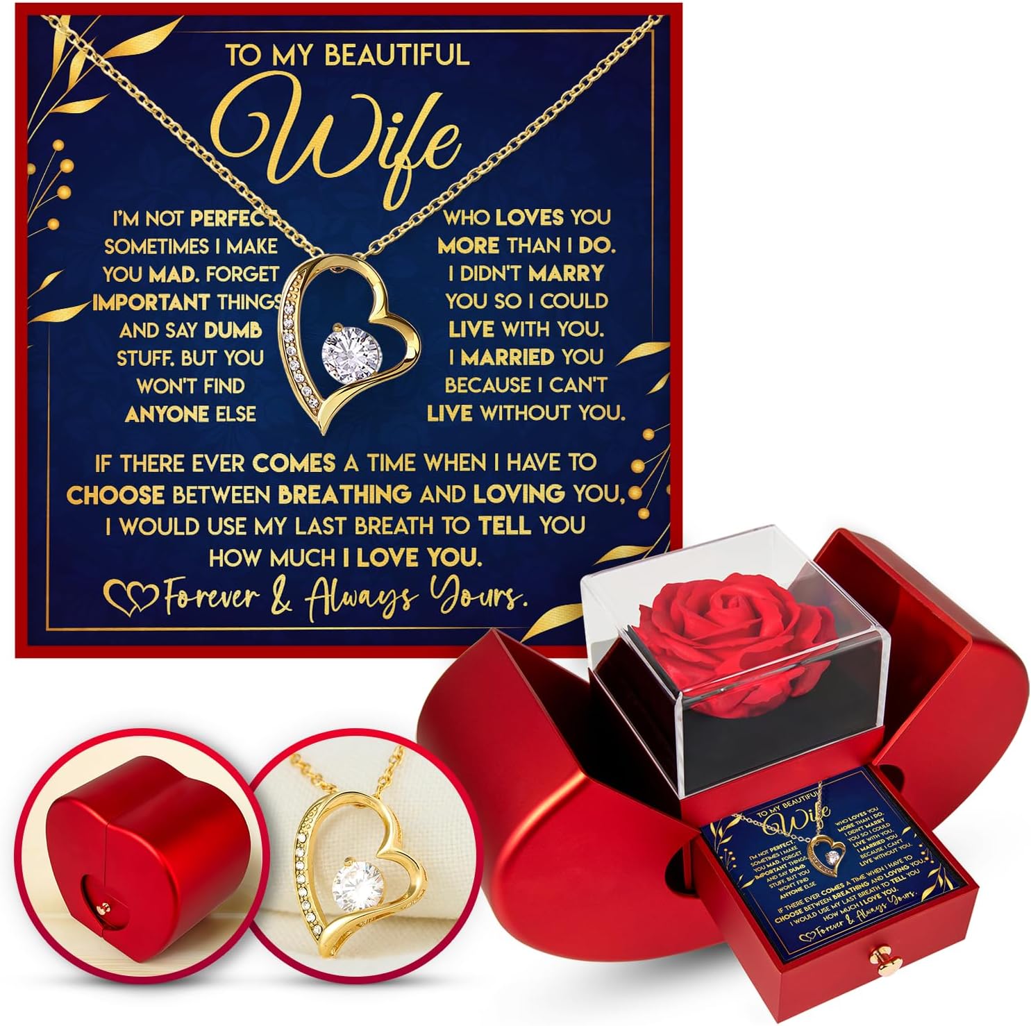 Create an unforgettable gifting experience with our elegant Necklace and Heart Box gift set. The everlasting rose symbolizes eternal love, while the sparkling necklace serves as the perfect token of your love. Ideal for birthdays, anniversaries, or any special occasion, this beautiful package is guaranteed to make your loved one feel truly cherished and appreciated.Heart Box Specifications: Size: 13 x 9 x 12.5 cmOuter material: acrylic, plasticInner material: black velvet material, sponge filler drawer, soap roseColor: redForever Love Necklace specifications:14k white gold over stainless steel or 18k yellow gold over stainless steel6.5mm round cut cubic zirconia stonePendant dimensions: 0.8" (2.2cm) height / 0.7" (1.8cm) widthAdjustable chain length: 18" - 22" (45.72cm - 55.88cm)Lobster clasp attachmentLove Knot Necklace specifications:Size: 5.1” x 5.1” x 3.7” (130 x 130 x 95mm)Weight: 14.2oz (404g) Box Color: RedMaterial: spray paint, acrylic cover, decorative faux flower, sponge core lining, gold-plated handle.Alluring Beauty Necklace specifications:14k white gold over stainless steel or 18k yellow gold over stainless steel7mm round cut cubic zirconia stonePendant dimensions: 0.8" (20mm) height / 0.4" (10mm) widthAdjustable length: 18" - 22" (45.72 cm - 55.88 cm)Lobster clasp attachmentEach order is lovingly packaged and ready to be cherished for a lifetime!