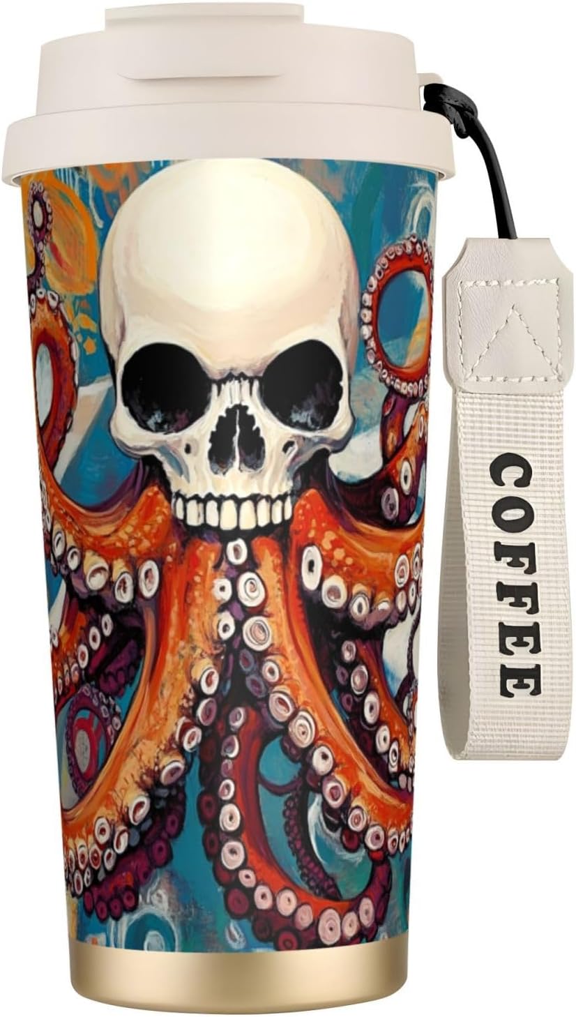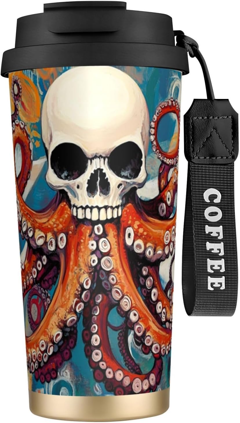 Skeleton Octopus Experience the ultimate blend of style and functionality with our uniquely designed coffee mug. Perfectly suited for those who appreciate individuality, this 16 oz tumbler features a full-print, customized design that sets it apart from ordinary mugs. Made from top-grade 316 stainless steel on the inside and 201 stainless steel on the outside, along with a PP lid and straw, this mug is not only stylish but also incredibly durable.The superior insulation keeps your drinks at the desired temperature for more than 12 hours, ensuring you can enjoy your coffee, tea, or any other beverage no matter the weather. The ergonomic, tapered shape of the mug provides a comfortable and firm grip, making it easy to handle and carry. Whether you're on the go, relaxing at home, or working in the office, this versatile tumbler is the perfect companion.Additional features include a dual-drink lid, a convenient straw, and a sturdy nylon wrist strap for portability. The non-slip base adds an extra layer of security, keeping your drink stable on any surface. For cleaning, simply wash with water or wipe down; avoid using bleach or a dishwasher. Note that due to different measurement methods, a slight variation of 1-3 cm in size is considered normal.Make a statement with our unique, customized coffee mug, and elevate your drinking experience today!